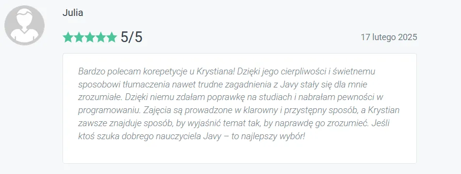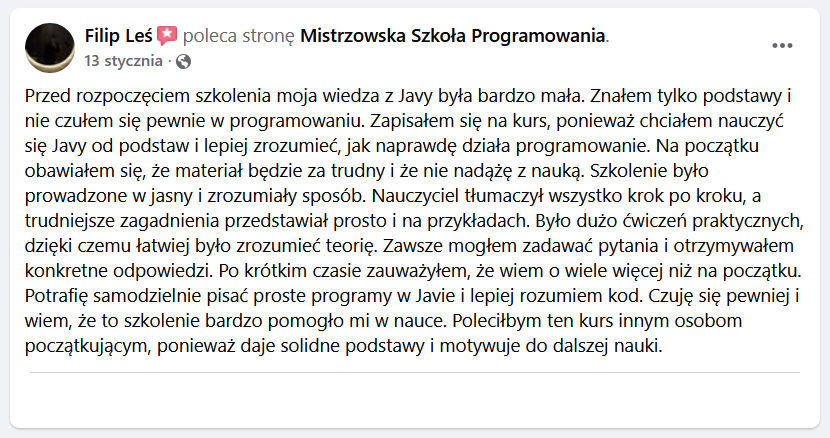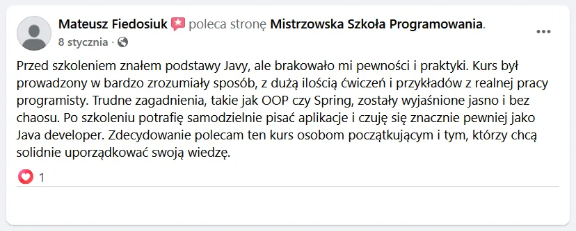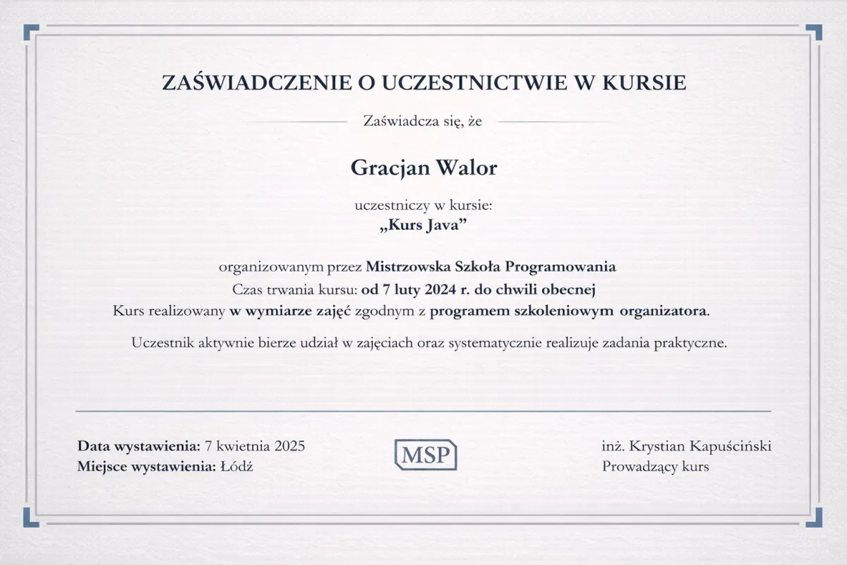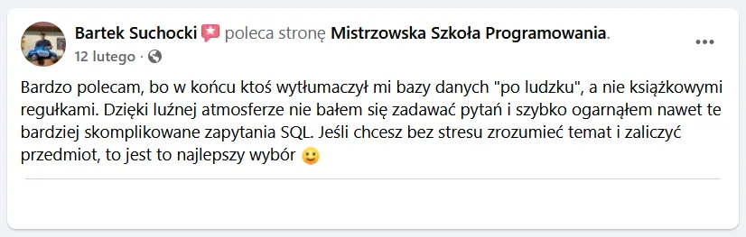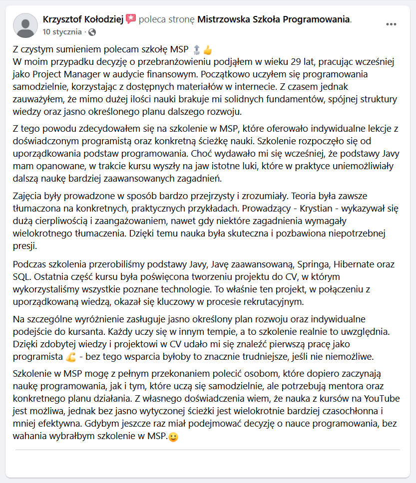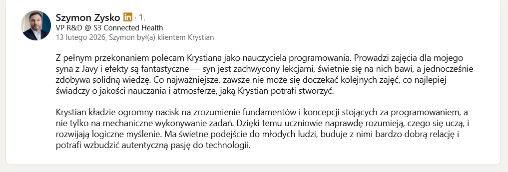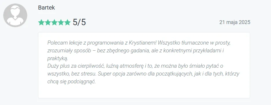 Bo tanie kursy online uczą Cię oglądania programowania, nie programowania. Żaden z nich nie patrzy na Twój kod. Żaden nie powie Ci, co konkretnie robisz źle. Żaden nie przeprowadzi Cię przez code review. Żaden nie pomoże Ci zbudować CV. Tani kurs online to jak kupno podręcznika do jazdy samochodem bez wyjazdu na drogę - możesz znać teorię idealnie i nadal nie umieć prowadzić.