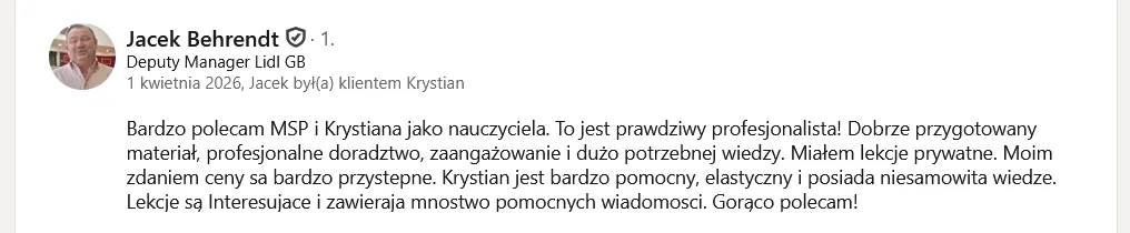 Zajęcia odbywają się online od poniedziałku do piątku. Realnie kilka godzin dziennie, łącznie z samodzielną pracą. To szkolenie jest intensywne. Musi być intensywne, bo intensywna nauka daje efekty, a powierzchowna daje jedynie złudzenie postępów.